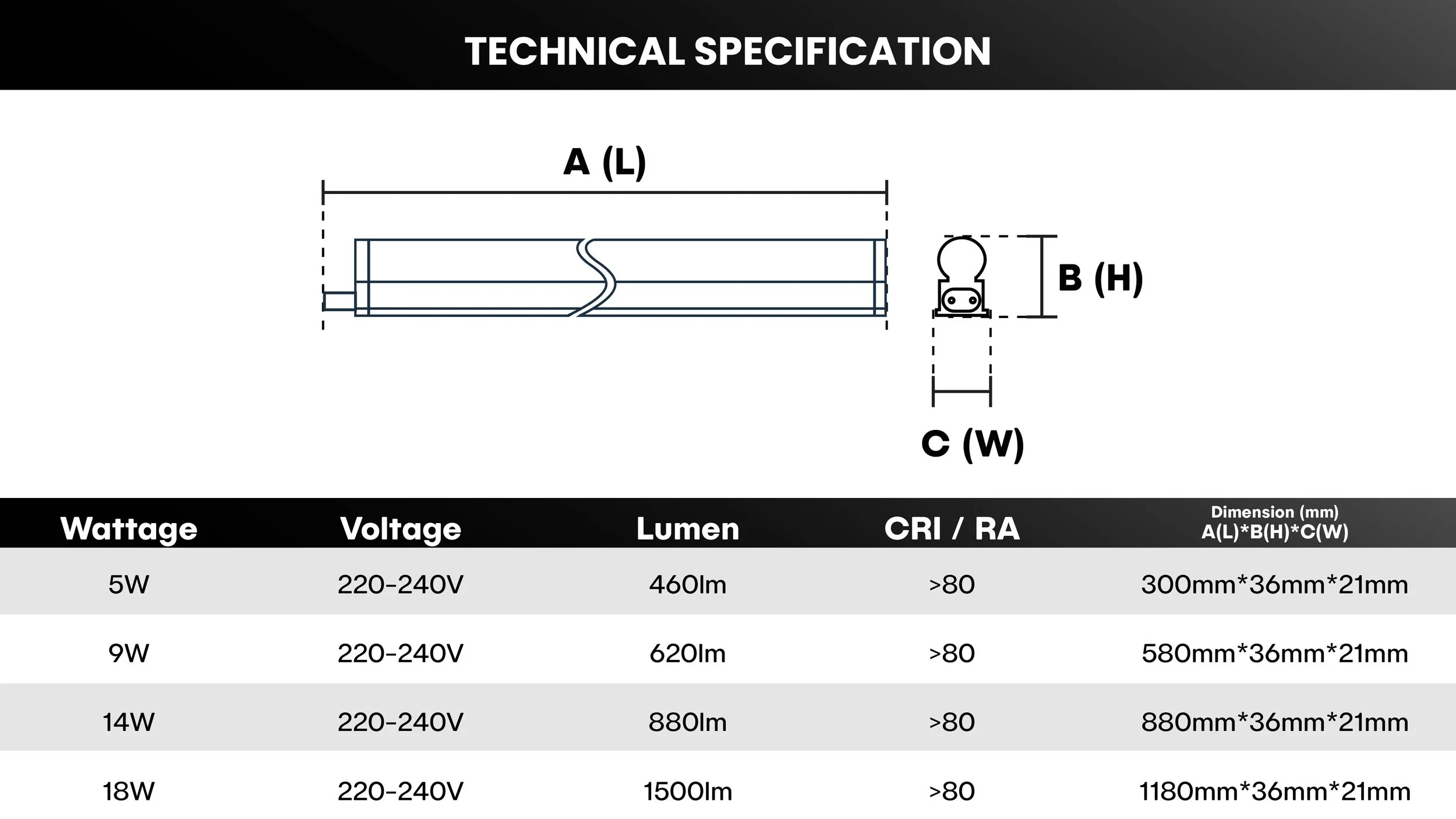 LUXORI T5 Wattage, Voltage, Lumen, CRI, Dimension
